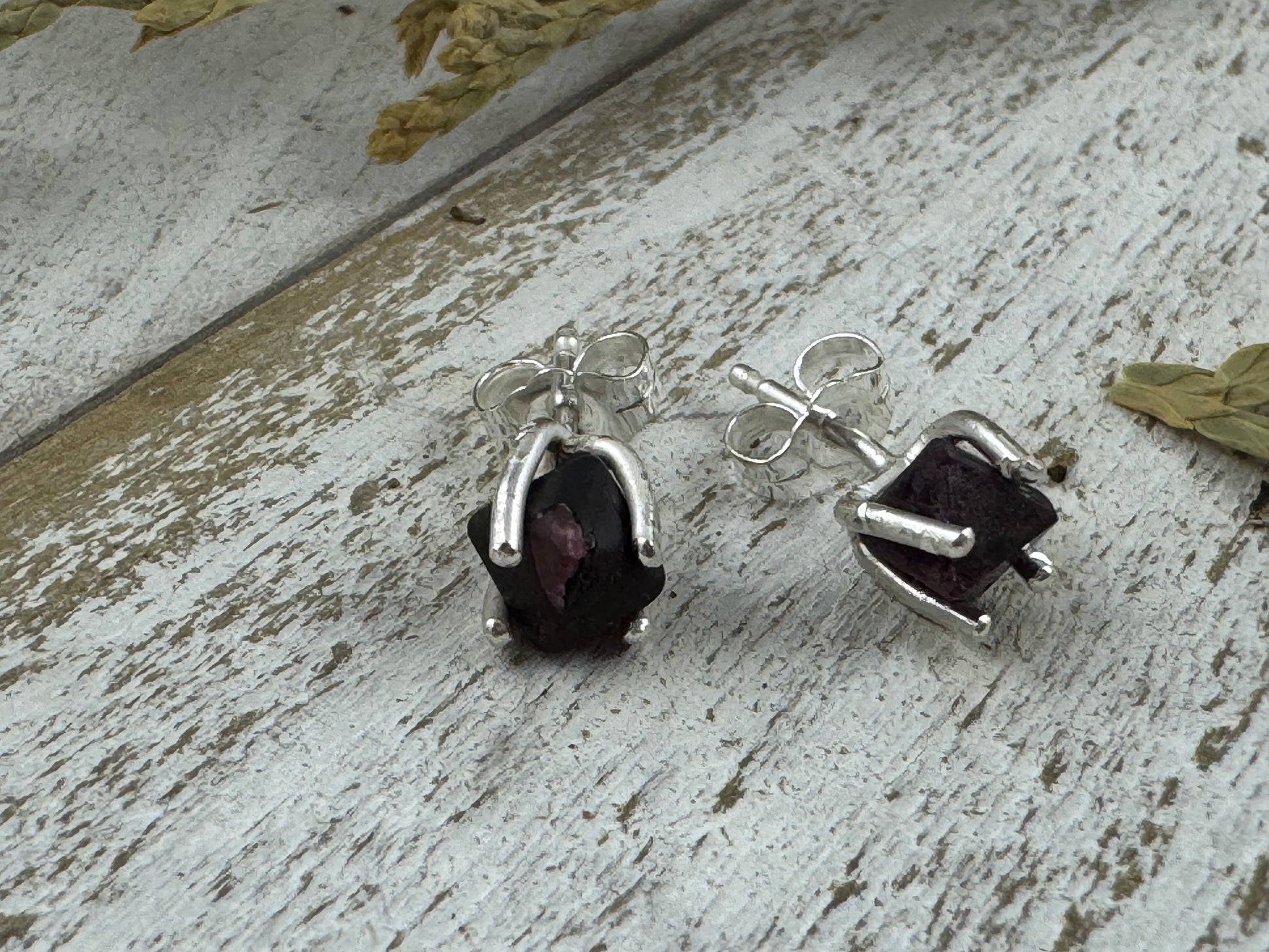 Small yet fiercely radiant, these Spinel Earth Studs pack a world of fiery energy into each delicate 4mm gemstone. Each rough-cut spinel is cradled in a handcrafted sterling silver setting, its natural form left untouched to showcase the gem’s vibrant hues and unique character. Some settings feature your signature tree bark texture, while others remain polished, allowing the spinel’s bold glow to shine through.